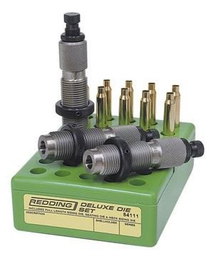 Набор матриц Redding Deluxe Die Set для релоадинга нарезных патронов состоит из матрицы полной обжимки full length resizing die ( FL ), матрицы обжимки горлышка гильзы neck resizing die ( NK ) и матрицы для посадки пули seating die ( ST ).